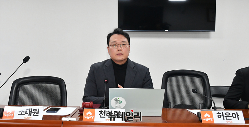 천하람 개혁신당 원내대표가 21일 오전 국회 의원회관에서 열린 긴급 최고위원회의에서 발언을 하고 있다.