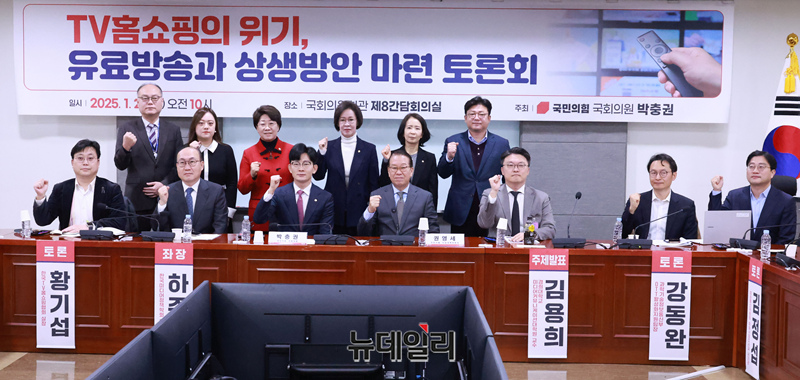 TV홈쇼핑의 위기, 유료방송과 상생방안 마련 토론회가 21일 오전 국회의원회관에서 열린 가운데 권영세 국민의힘 비상대책위원장, 박충권 의원 등 참석자들이 기념촬영을 하고 있다.