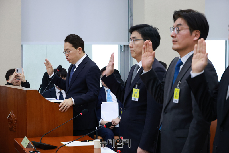 쿠팡 택배노동자 근로 조건 개선·대유위니아그룹 임금체불 관련 청문회에서가 21일 국회 환경노동위원회에서 열린 가운데 강한승 쿠팡 대표 및 증인들이 선서를 하고 있다. (오른쪽부터 강한승 쿠팡 대표, 홍용준 쿠팡로지틱스 대표, 정종철 쿠팡풀먼트서비스 대표, 박현철(박영우 회장 조카) 위니아전자 전 대표, 박은진(박영우 회장 차녀) 대유에이텍 부사장)