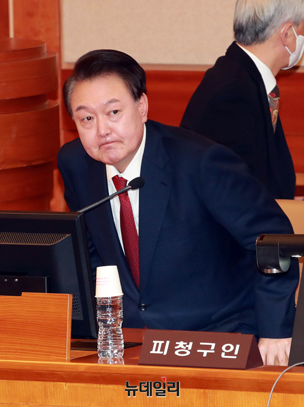 윤석열 대통령이 21일 오후 서울 종로구 헌법재판소에서 열리는 탄핵심판 3차 변론에 출석해 차기환 변호사와 대화를 나누고 있다. (사진=공동취재단)