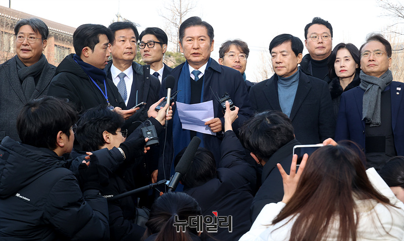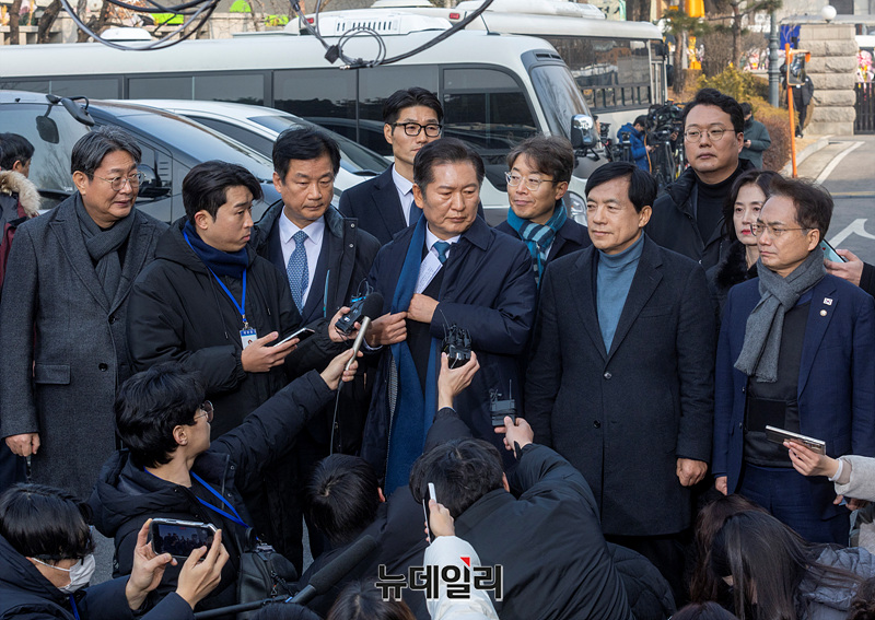 정청래 단장 등 탄핵소추단이 21일 오후 서울 종로구 헌법재판소에서 열린 윤석열 대통령 탄핵심판 3차 변론기일에 출석하며 취재진의 질문에 답하고 있다. (사진=공동취재단)