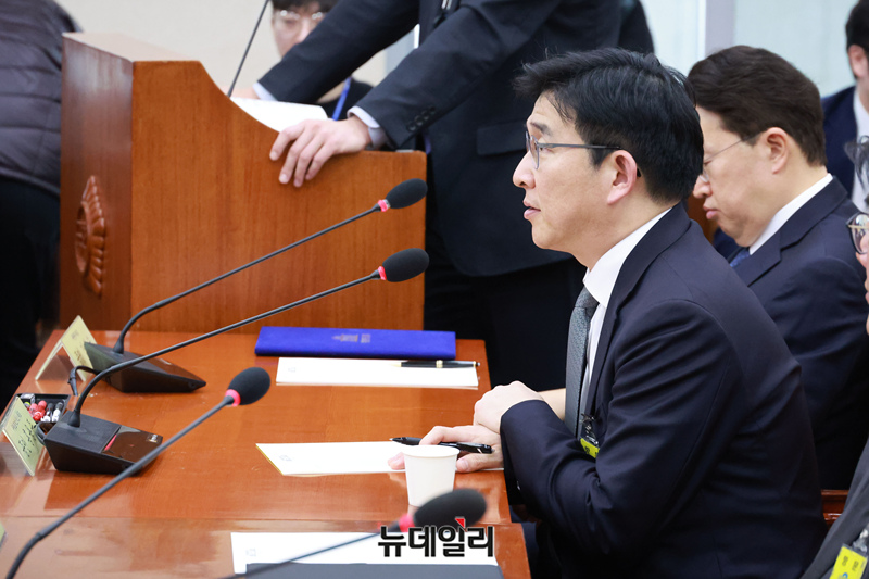 홍용준 쿠팡로지스틱스서비스(CLS) 대표가 21일 오전 국회에서 열린 환경노동위원회의 쿠팡 택배노동자 근로 조건 개선·대유위니아그룹 임금체불 관련 청문회에서 의원들의 질문에 답하고 있다.