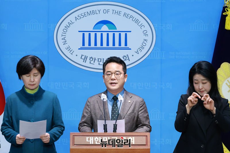 한병도, 백혜련, 민병덕 더불어민주당 내란 국정조사특별위원회 위원들이 21일 오전 국회 소통관에서 기자회견을 갖고 증인출석 관련 기자회견을 갖고 있다.