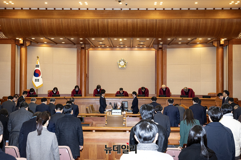 윤석열 대통령 탄핵심판 3차 변론이 열린 21일 오후 서울 종로구 헌법재판소 대심판정에 정계선(왼쪽부터), 김복형, 정정미, 이미선, 문형배, 김형두, 정형식, 조한창 헌재 재판관들이 앉아 있다. (사진=공동취재단)