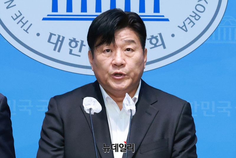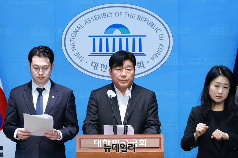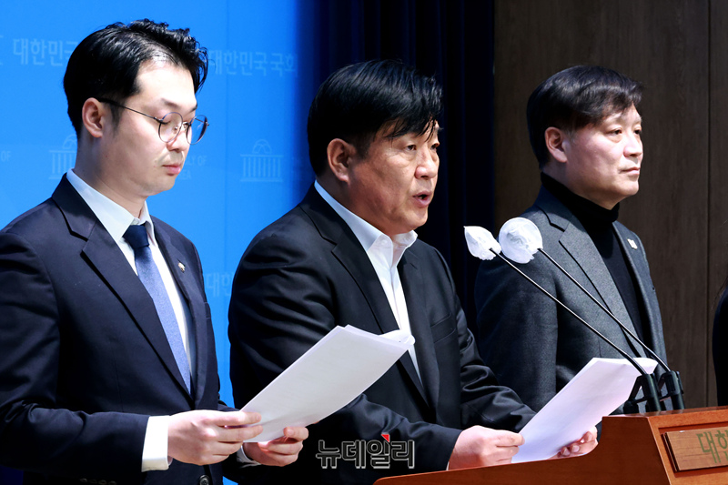 양문석 더불어민주당 의원 등 참석자들이 21일 오후 국회 소통관에서 온라인상 특정인 살해 및 테러 예고자에 대한 수사 촉구 기자회견을 갖고 있다.