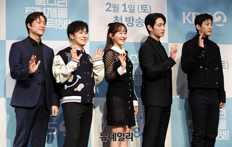 배우 최대철 김동완, 윤박, 이석기, 박효주가 22일 오후 서울 구로구 라마다 신도림 호텔에서 열린 KBS2 새 주말드라마 '독수리 5형제를 부탁해!' 제작발표회에서 포즈를 취하고 있다.
