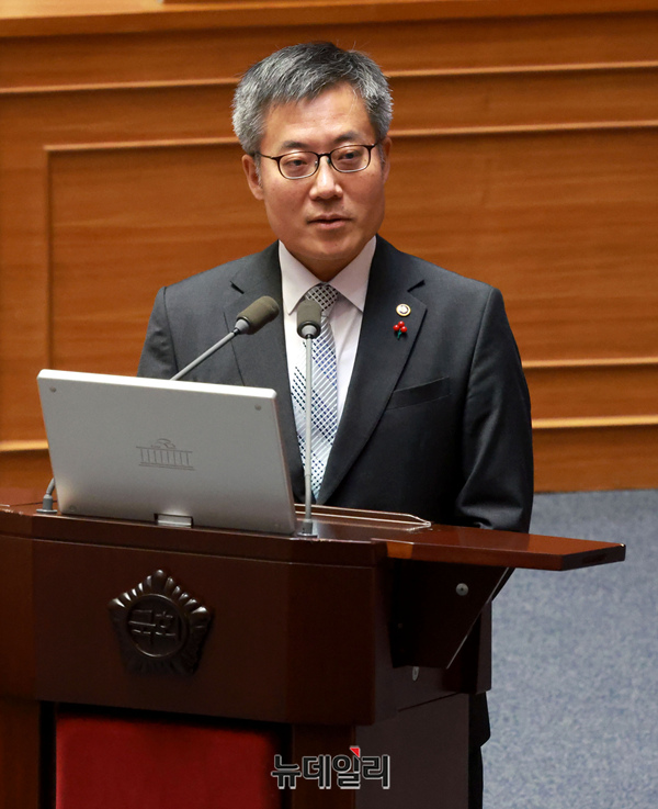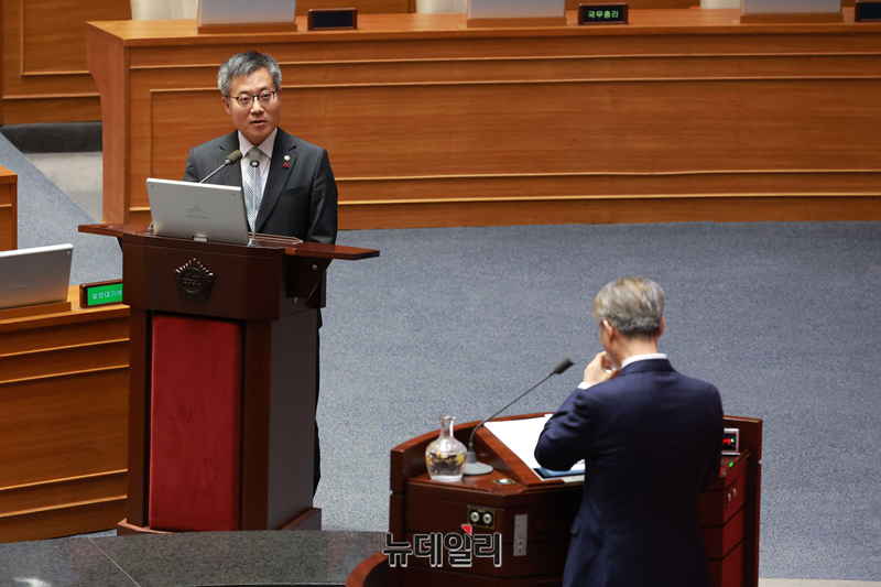김석우 법무부 장관 직무대행이 23일 오후 국회 본회의에서 열린 '서울서부지법 난입 사태' 관련 긴급 현안질문에서 의원들의 질문에 답하고 있다.