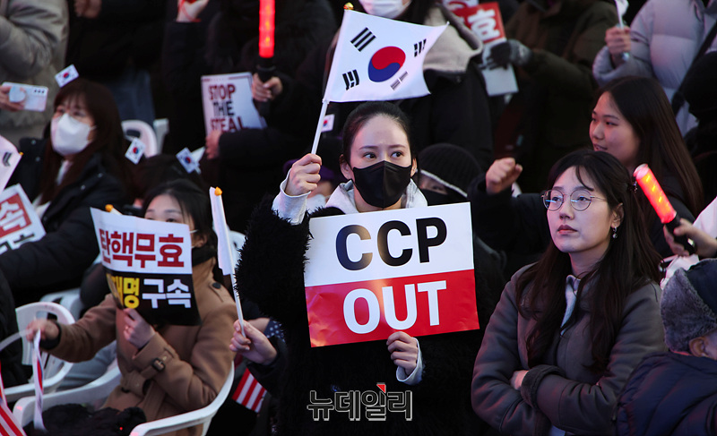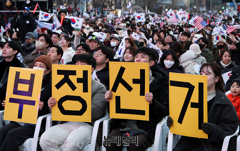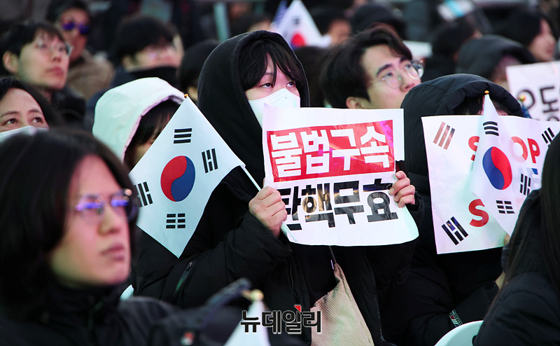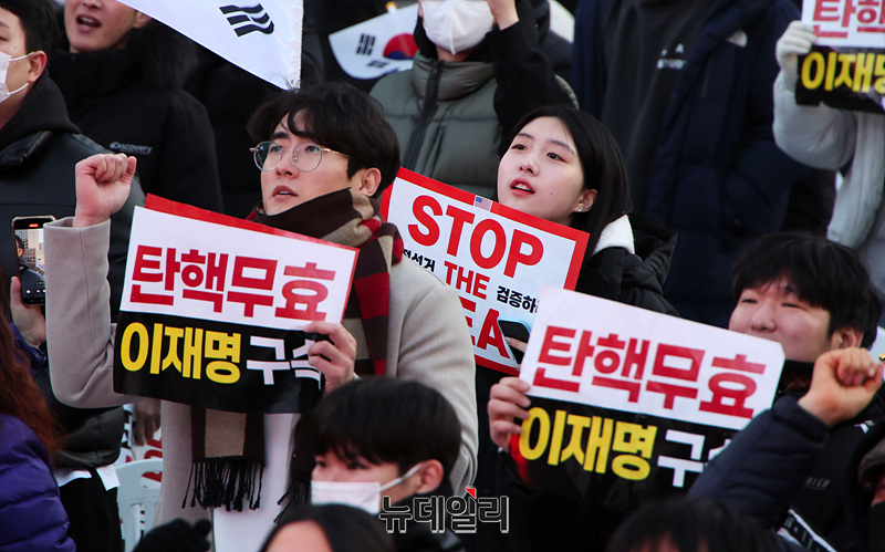 설 연휴가 시작된 25일 오후 서울 광화문 일대에서 대한민국바로세우기국민운동본부(대국본) 주최로 열린 탄핵 반대 국민대회에 2030세대가 참석해 자리하고 있다.