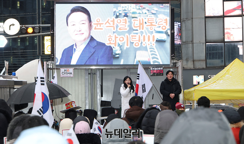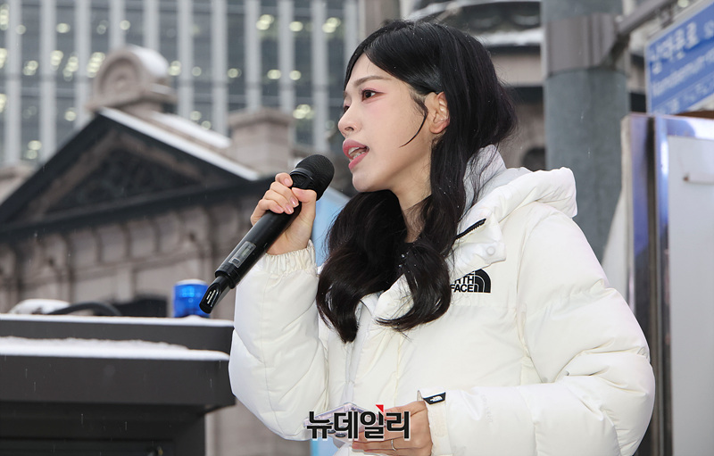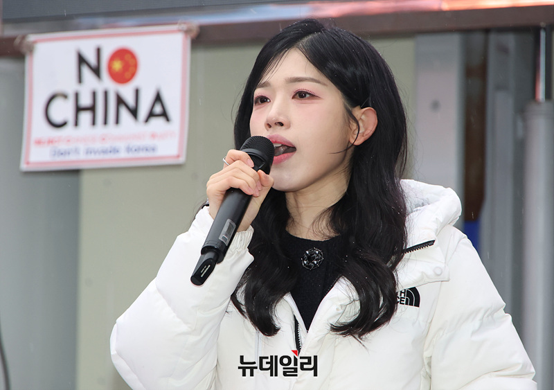 백지원 전 국민의힘 상근부대변인이 31일 오후 서울 중국대사관 앞에서 '탄핵반대-주권침탈행위 저지'를 주제로 열린 토크 콘서트에서 발언하고 있다.