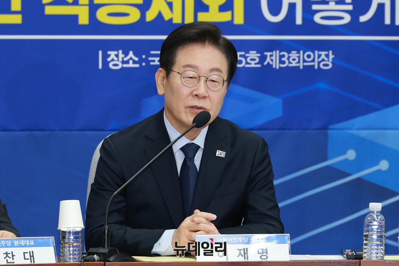 이재명 더불어민주당 대표가 3일 오전 국회에서 '행복하고 정의로운 대한민국, 반도체특별법 노동시간법 적용제외 어떻게?'라는 주제로 열린 정책 디베이트에서 모두발언을 하고 있다.