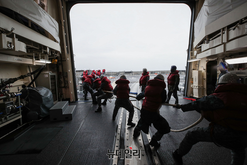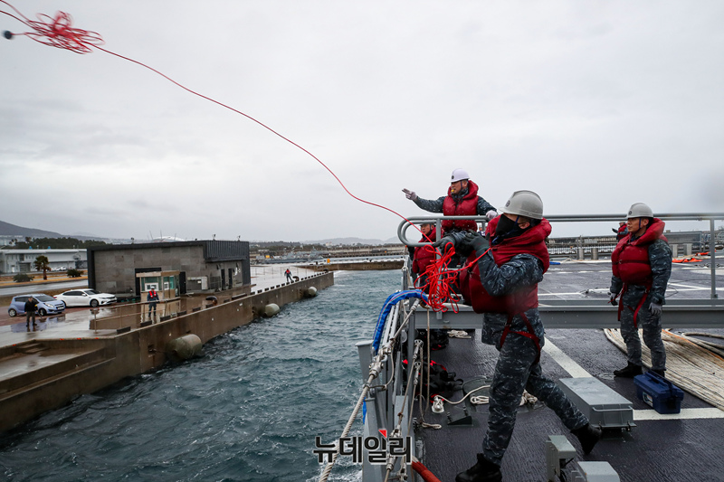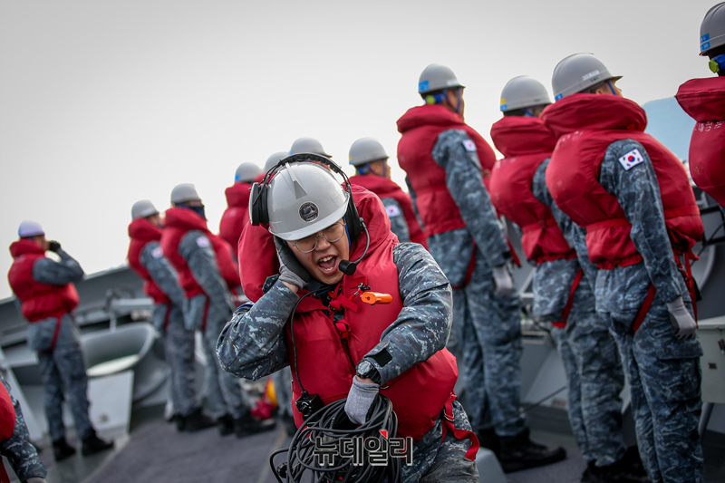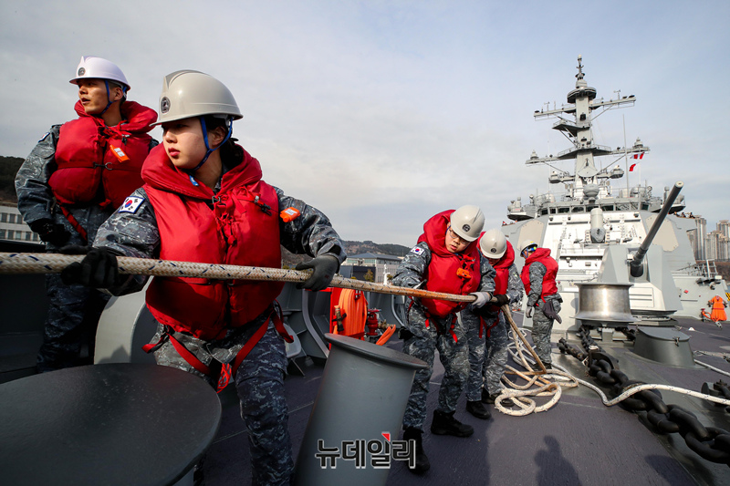 해군기동함대사령부 최신예 이지스구축함 정조대왕함(DDG-II·8200톤급) 승조원들이 1일 부산 해군작전기지에서 실시된 전투배치 훈련에서 출항 준비를 하고 있다. (사진=공동취재단)