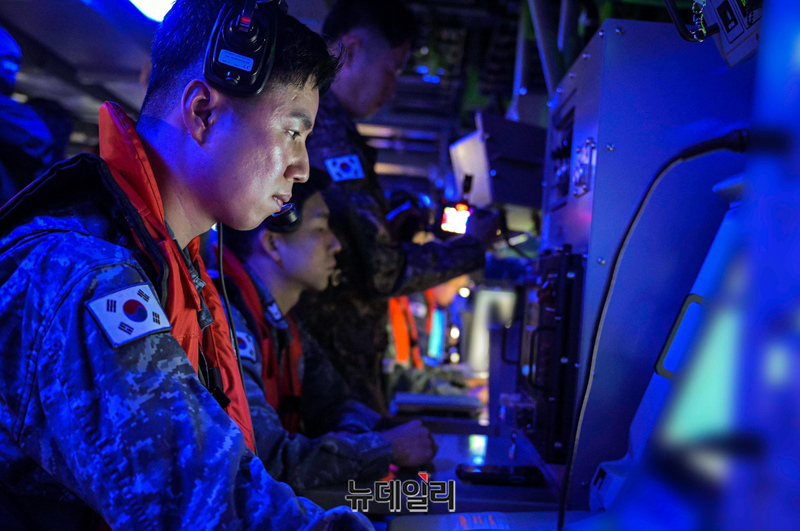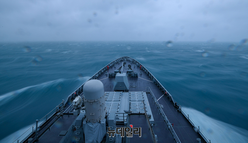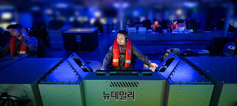 해군기동함대사령부 최신예 이지스구축함 정조대왕함(DDG-II·8200톤급)에 탑승한 당직사관이 1일 해군제주기지로 나란히 항해하는 서애류성룡함의 방위를 확인하고 있다. (사진=공동취재단)