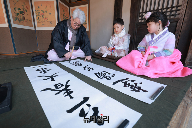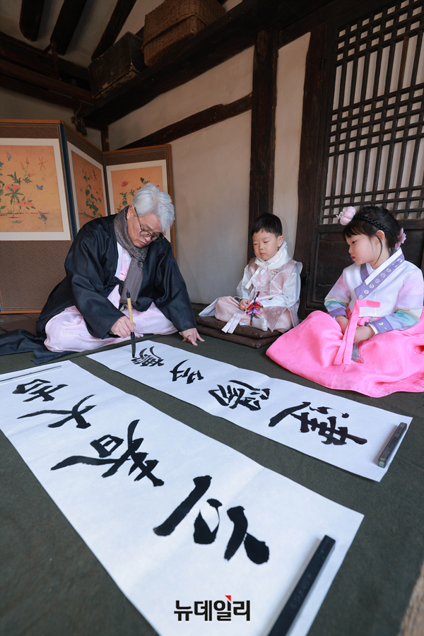 국립민속박물관이 입춘인 3일 오전 서울 종로구 박물관 내 오촌댁에서 입춘첩을 쓰고 있다.