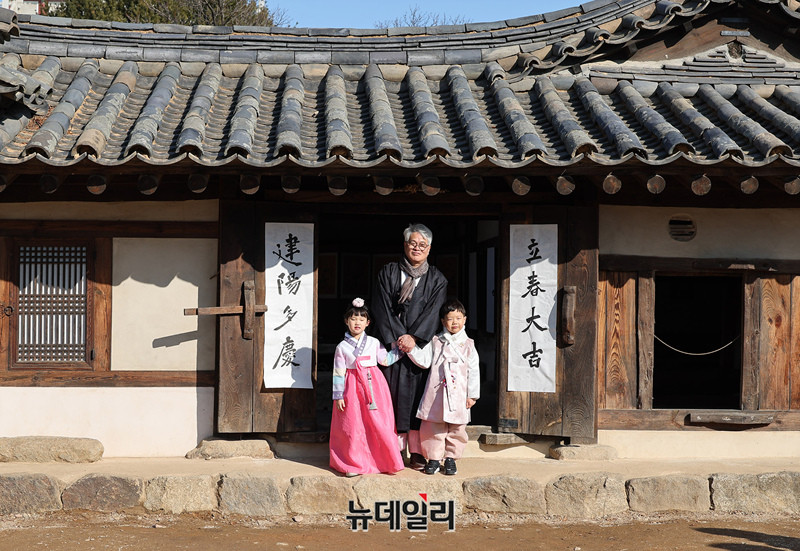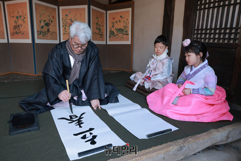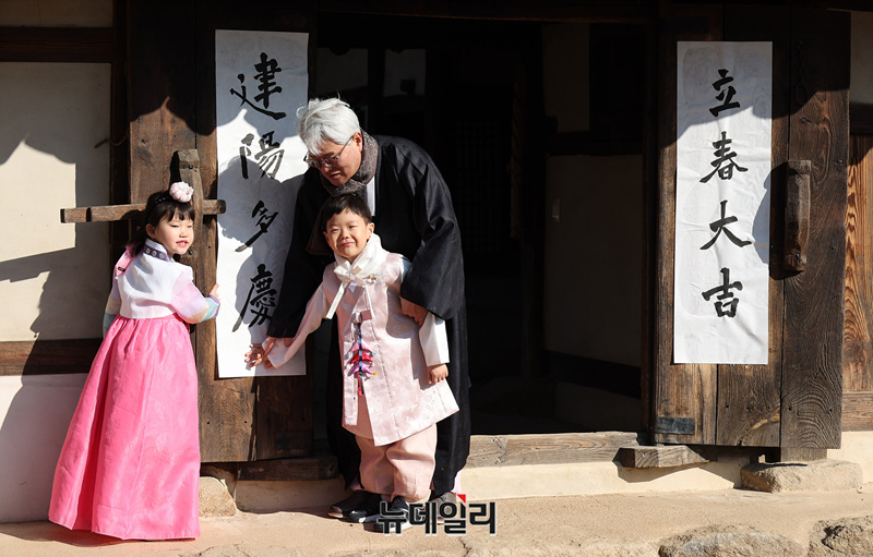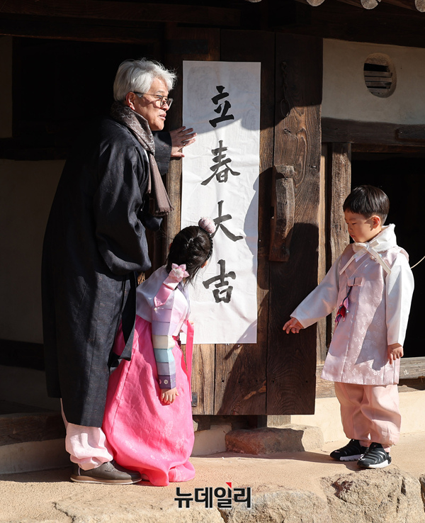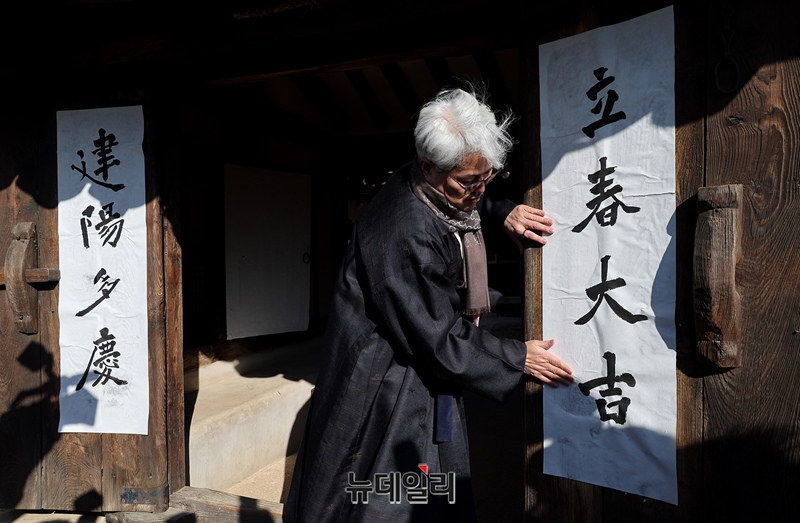 국립민속박물관이 입춘인 3일 오전 서울 종로구 민속박물관 내 오촌댁에서 입춘첩을 쓰고 대문에 붙이는 시연을 하고 있다.입춘은 24절기 중 첫 번째에 해당하는 절기로 봄의 시작을 알린다. 새해에 복을 기원하는 마음으로 대문이나 기둥 또는 벽에 써붙였던 글씨가 입춘첩이다.입춘첩에는 보통 '입춘대길 건양다경(봄이 시작되니 크게 길하고, 양기가 태동하니 경사가 많으리라)' '소지황금출 개문만복래(땅을 쓸면 황금이 생기고 문을 열면 만복이 온다)' 등의 글씨를 써 붙인다.