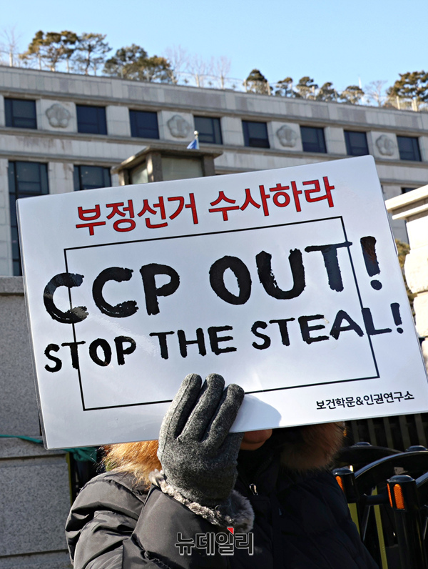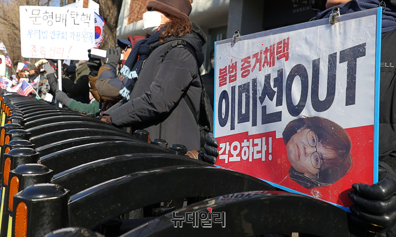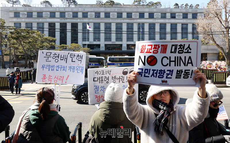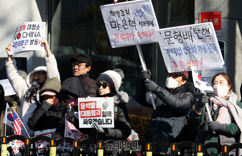 윤석열 대통령 지지자들이 3일 오후 서울 종로구 헌법재판소 인근에서 헌재의 마은혁 헌법재판관 후보자 임명과 관련한 위헌 여부 판단을 앞두고 헌법재판관들을 규탄하고 있다.