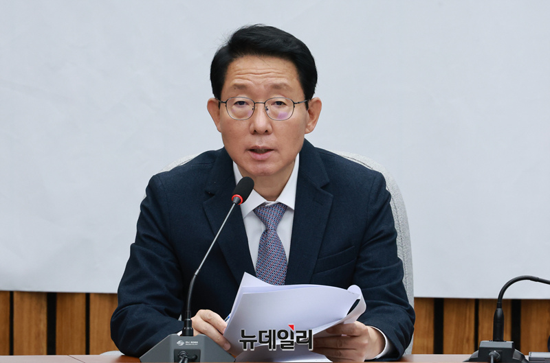 김상훈 국민의힘 정책위의장이 4일 오전 국회에서 열린 원내대책회의에서 모두발언을 하고 있다.