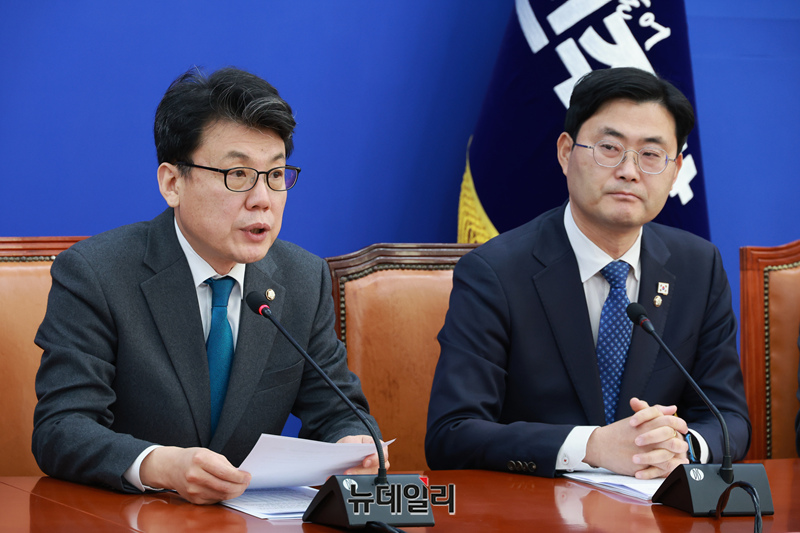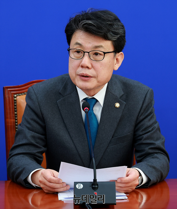 진성준 더불어민주당 정책위의장이 4일 국회에서 열린 원내대책회의에서 모두발언을 하고 있다.