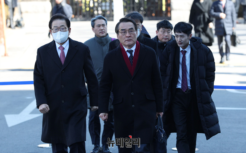 윤석열 대통령 탄핵심판 5차 변론기일이 열린 4일 오후 배보윤 변호사를 비롯한 피청구인 측 변호인단이 서울 종로구 헌법재판소 심판정으로 향하고 있다. (사진=공동취재단)