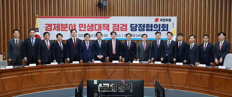 권성동 국민의힘 원내대표 및 참석자들이 4일 국회에서 열린 경제 분야 민생대책 점검 당정협의회에서 기념촬영을 하고 있다.