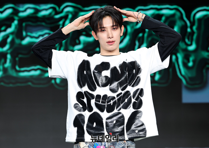 올아워즈 건호가 4일 오후 서울 강남구 일지아트홀에서 열린 세번째 미니앨범 '스모크 포인트' 쇼케이스에서 포즈를 취하고 있다.