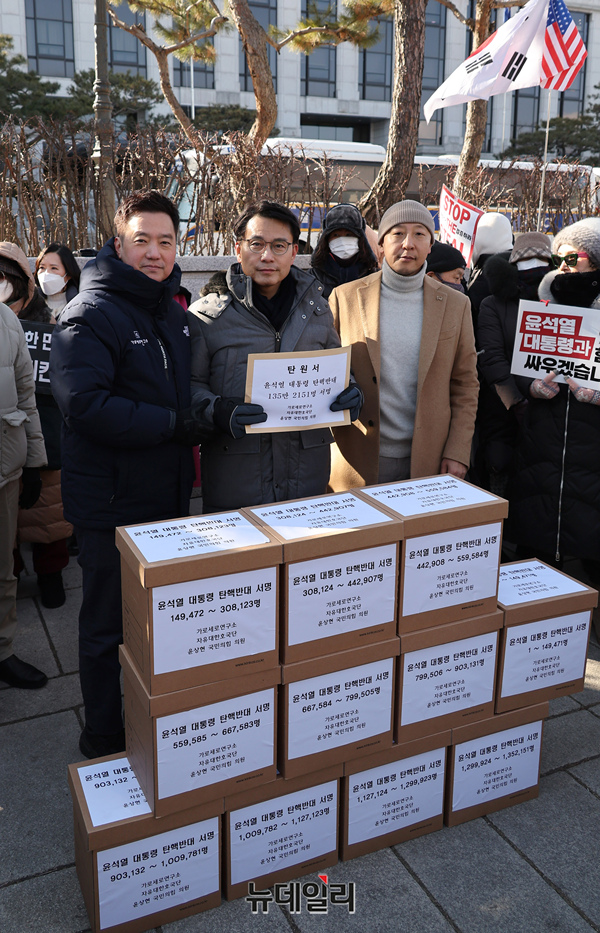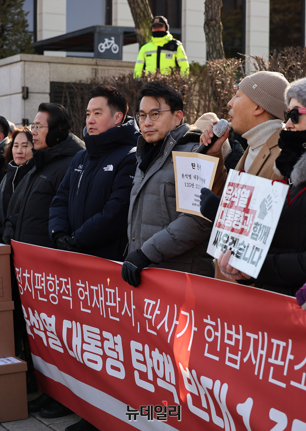 윤상현 국민의힘 의원, 가로세로연구소, 자유대한호국단이 5일 오후 서울 종로구 헌법재판소 앞에서 윤석열 대통령 탄핵반대에 서명한 135만 2,151명의 시민들의 탄원서를 헌법재판소에 전달하며 기자회견을 갖고 있다.윤 의원은 "대통령 탄핵은 개인의 탄핵이 아니라 대한민국 체제와 미래에 대한 탄핵이며, 후손들에 대한 탄핵"이라고 말했다.