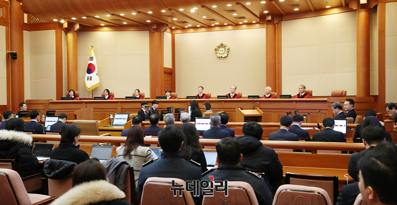 문형배 헌법재판소장 직무대행을 비롯한 헌법재판들이 6일 오전 서울 종로구 헌법재판소에서 열린 탄핵 심판 6차 변론기일에 참석해 자리하고 있다. (사진=공동취재단)