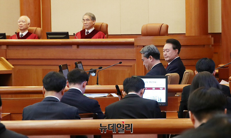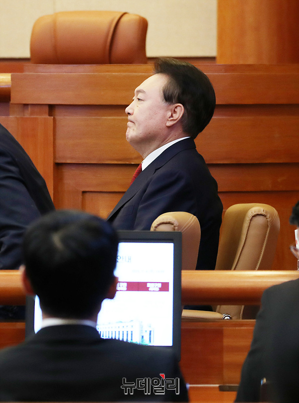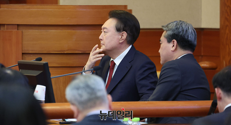 윤석열 대통령이 6일 오전 서울 종로구 헌법재판소에서 열린 탄핵 심판 6차 변론기일에 참석해 자리하고 있다. (사진=공동취재단)