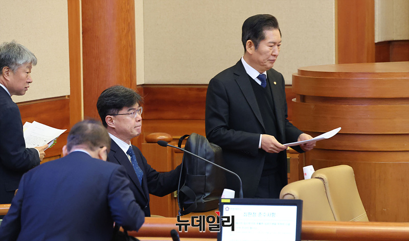정청래 탄핵소추위원장이 6일 오전 서울 종로구 헌법재판소에서 열린 탄핵 심판 6차 변론기일에 출석해 자리하고 있다. (사진=공동취재단)