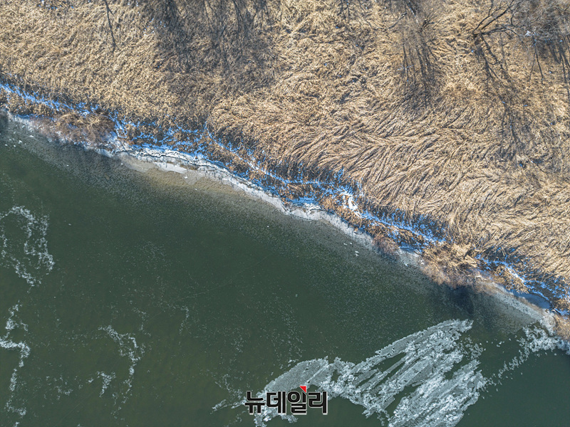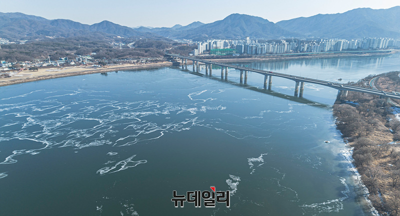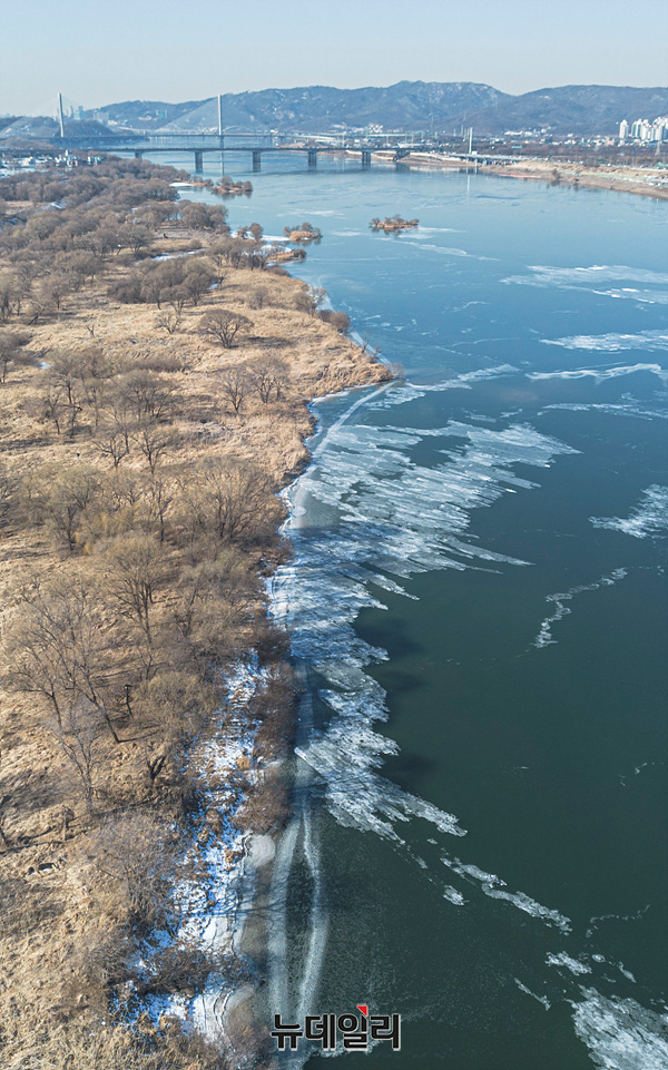강추위가 이어지는 6일 오전 경기 하남시에서 드론으로 본 한강이 꽁꽁 얼어있다.기상청에 따르면 이날 서울의 아침 최저기온은 영하 11.5도를 기록했다. 북서쪽에서 찬 공기가 남하하면서 당분간 강추위가 이어질 전망이다.오늘 오후부터 전국 대부분 눈이 내릴 전망이다. 7일까지 예상 적설량은 △서울·인천·경기 북부, 경북 서부·북동내륙, 경남 서부내륙 1~5㎝ △경기 남부, 서해5도, 강원 내륙·산지, 대전·세종·충남 북부내륙, 충북 중·북부 3~8㎝ △충남 서해안, 충남 남부내륙, 충북 남부, 전북, 광주·전남 5~15㎝ △울릉도·독도, 제주도산지 5~10㎝ 등이다. (경기 하남=서성진 기자)