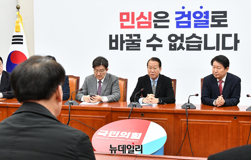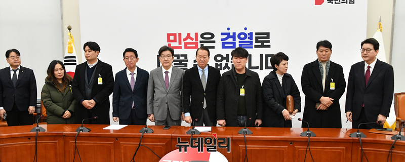 박한신 제주항공 여객기 참사 대표와 유가족들이 6일 오전 국회에서 국민의힘 지도부와 면담에서 발언을 듣고 있다.