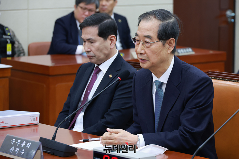 한덕수 국무총리가 6일 국회에서 열린 '윤석열 정부의 비상계엄 선포를 통한 내란 혐의 진상규명 국정조사 특별위원회' 3차 청문회에 출석해 의원들의 질문에 답하고 있다.