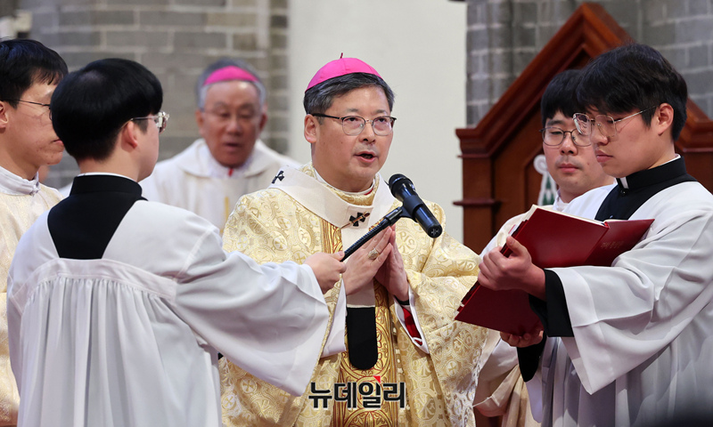 정순택 대주교가 6일 서울 중구 명동대성당에서 열린 2025년 천주교 서울대교구 부제 서품식에서 미사를 하고 있다. (사진=공동취재단)