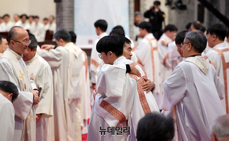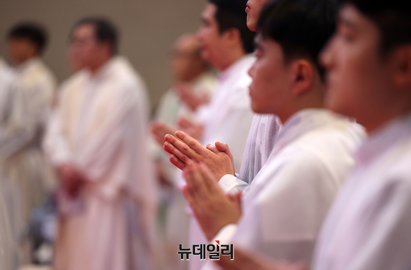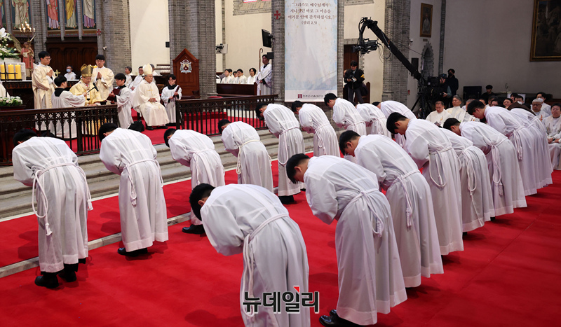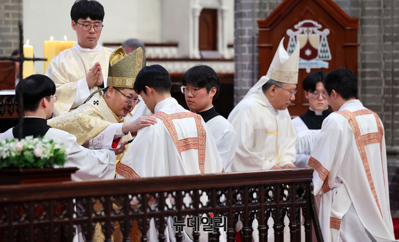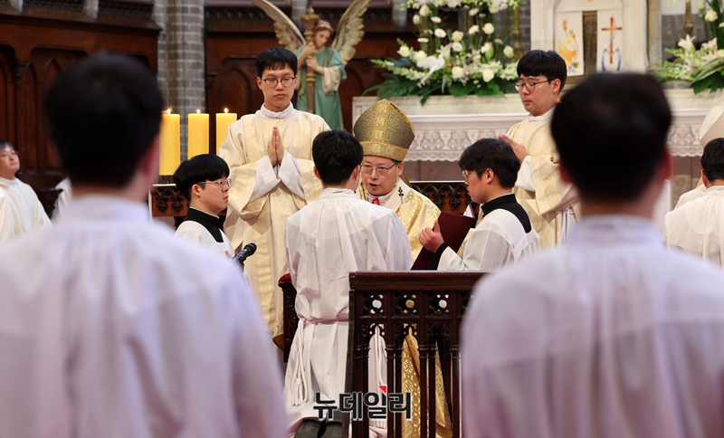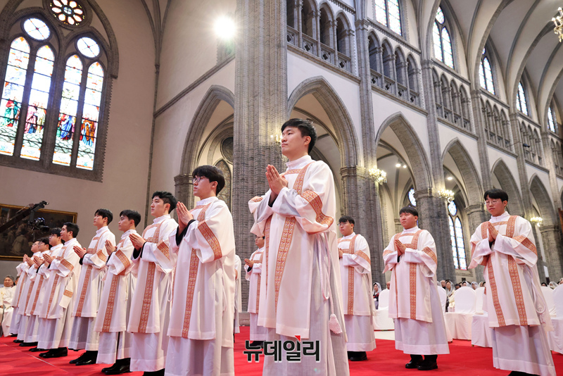 6일 서울 중구 명동대성당에서 열린 2025년 천주교 서울대교구 부제 서품식이 6일 서울 중구 명동대성당에서 거행되고 있다. (사진=공동취재단)