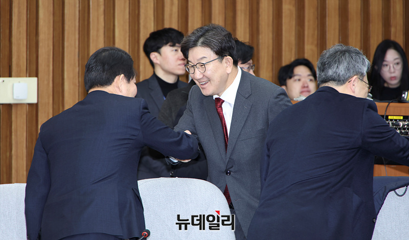 권성동 국민의힘 원내대표가 7일 오전 서울 여의도 국회에서 열린 원내대책회의에 참석하며 인사를 나누고 있다.