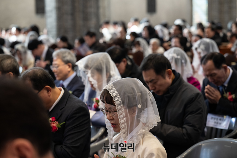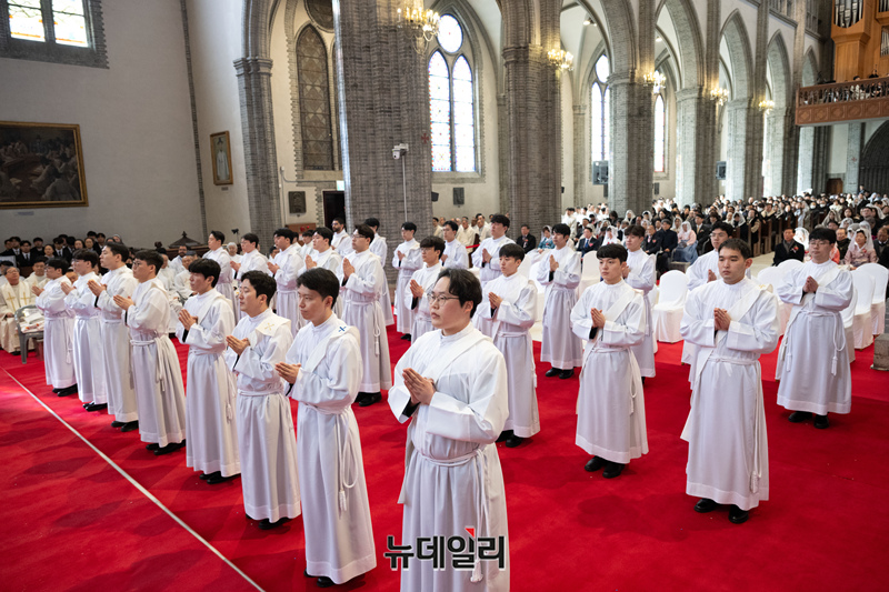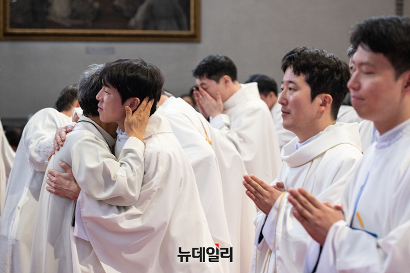 천주교 서울대교구가 서울 중구 명동대성당에서 사제 서품식을 거행한 7일 신임 사제들이 아버지 사제로부터 제의를 수여받고 있다. 부제 26명이 이날 성품성사를 받고 사제 품계를 받았다. (사진=공동취재단)