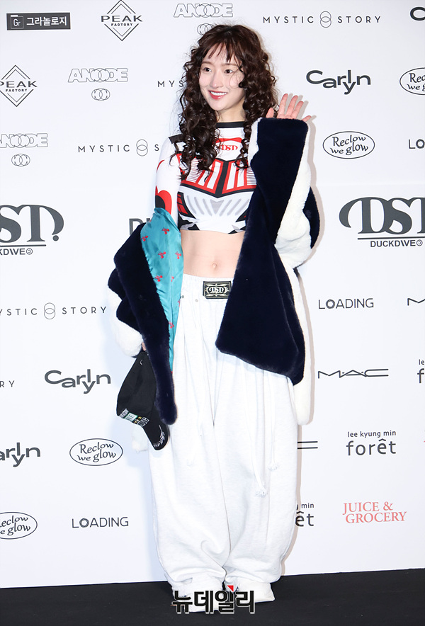 틱톡커 아이돌네이션(김혜수)이 7일 오후 서울 동대문디자인플라자에서 열린 2025 F/W 서울패션위크 덕다이브(DUCKDIVE) 포토월에서 포즈를 취하고 있다.