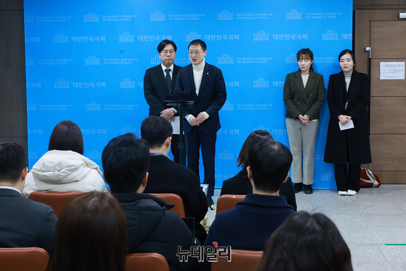 국민의힘 친한계 모임인 '언더73(1973년생 이하 정치인)'의 김상욱·김예지 의원과 박상수 인천서구갑 당협위원장, 정혜림 전 부대변인이 10일 국회 소통관에서 기자회견을 마치고 기자들의 질문에 답하고 있다.