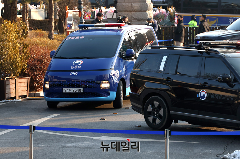 윤석열 대통령이 탑승한 호송차가 대통령 탄핵 심판 7차 변론이 열리는 11일 오전 서울 종로구 헌법재판소로 들어오고 있다. (사진=공동취재단)