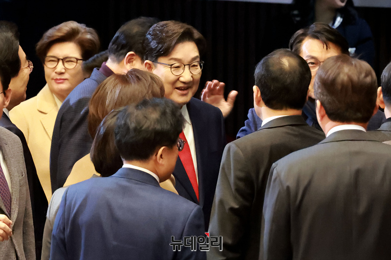 권성동 국민의힘 원내대표가 11일 오전 국회 본회의에서 교섭단체 대표 연설을 마치고 의원들과 인사를 나누고 있다.