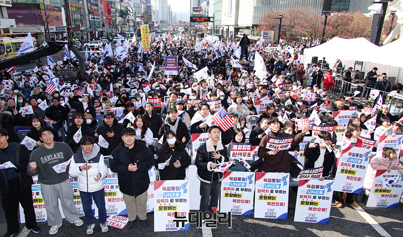 윤석열 대통령 탄핵을 반대하는 세이브코리아 국가비상기도회가 11일 천안버스터미널에서 열린 가운데 비상기도회 참가자들이 도로를 가득 메우고 있다.