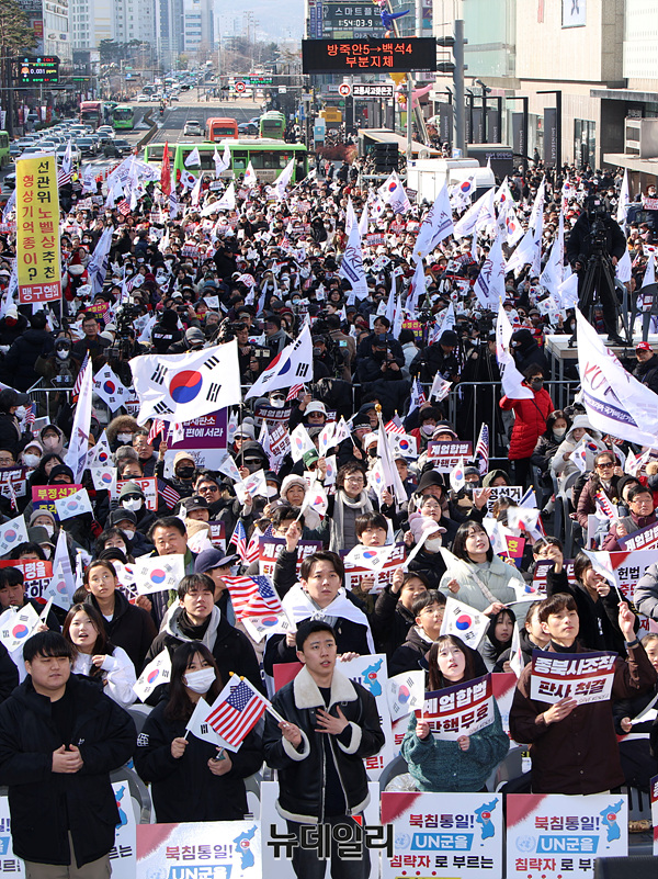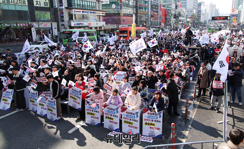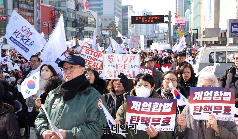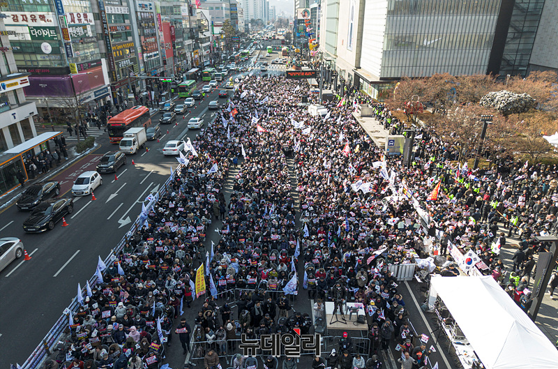 윤석열 대통령 탄핵을 반대하는 세이브코리아 국가비상기도회가 11일 천안버스터미널에서 열린 가운데 비상기도회 참가자들이 도로를 가득 메우고 있다.