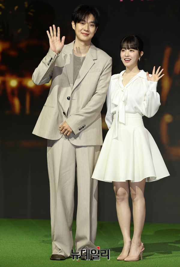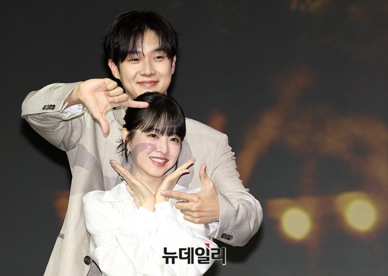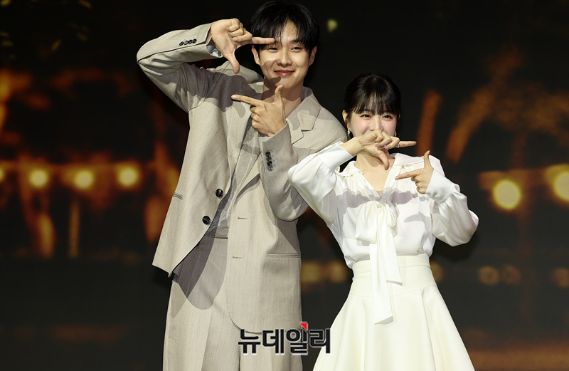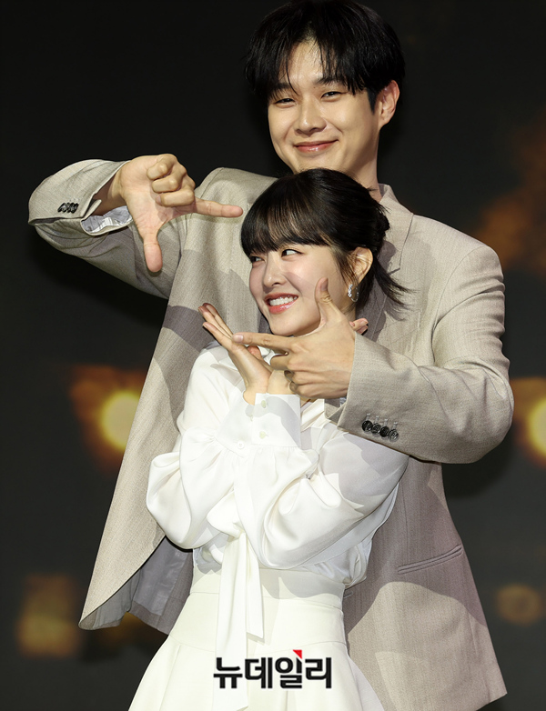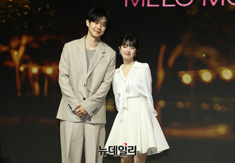 배우 최우식, 박보영이 12일 오전 서울 JW메리어트 동대문 스퀘어에서 열린 넷플릭스 시리즈 '멜로무비(연출 오충환)' 제작발표회에서 포즈를 취하고 있다.