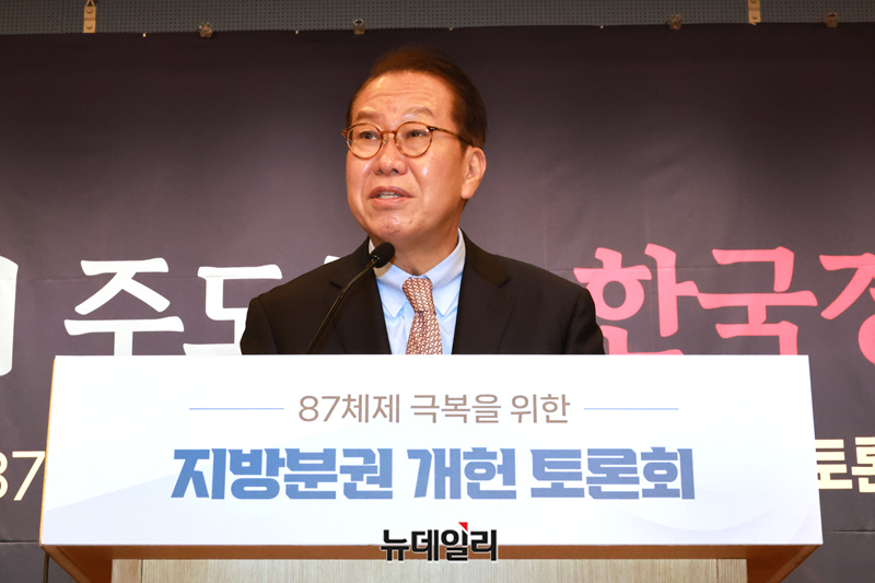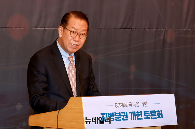 권영세 국민의힘 비상대책위원장이 12일 오전 국회 도서관에서 열린 '87체제 극복을 위한 지방분권 개헌 토론회'에서 축사를 하고 있다.
