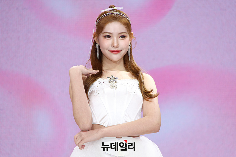 걸그룹 블링원 주니가 12일 오후 서울 중구 월드케이팝센터 CREST72홀에서 열린 싱글 2집 '버블 검(Bubble Gum)' 발매 기념 쇼케이스에서 포즈를 취하고 있다.
