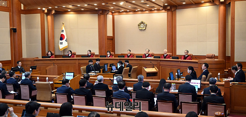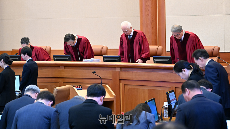 문형배 헌법재판소장 권한대행을 비롯한 헌법재판관들이 13일 서울 종로구 헌법재판소에서 열린 '윤석열 대통령 탄핵심판 8차 변론'에 참석하고 있다. (사진=공동취재단)