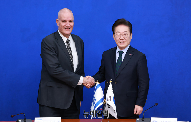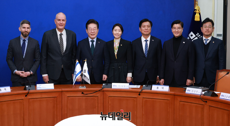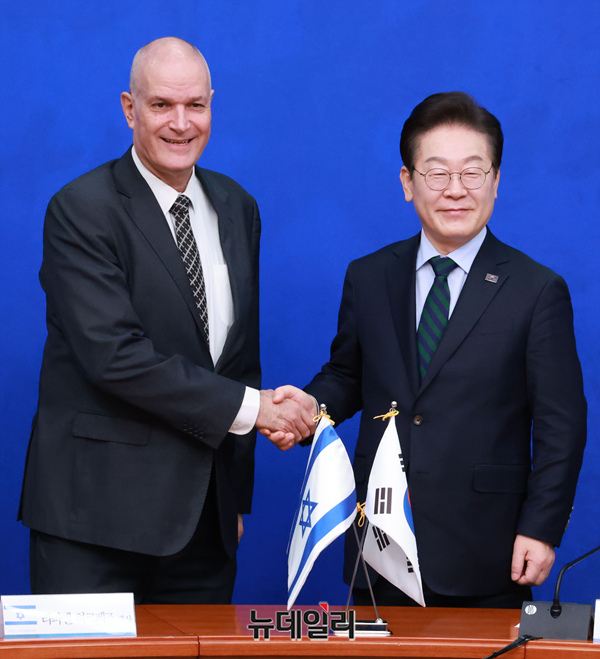 이재명 더불어민주당 대표가 13일 오전 국회에서 라파엘 하르페즈 주한 이스라엘 대사를 접견하고 있다.