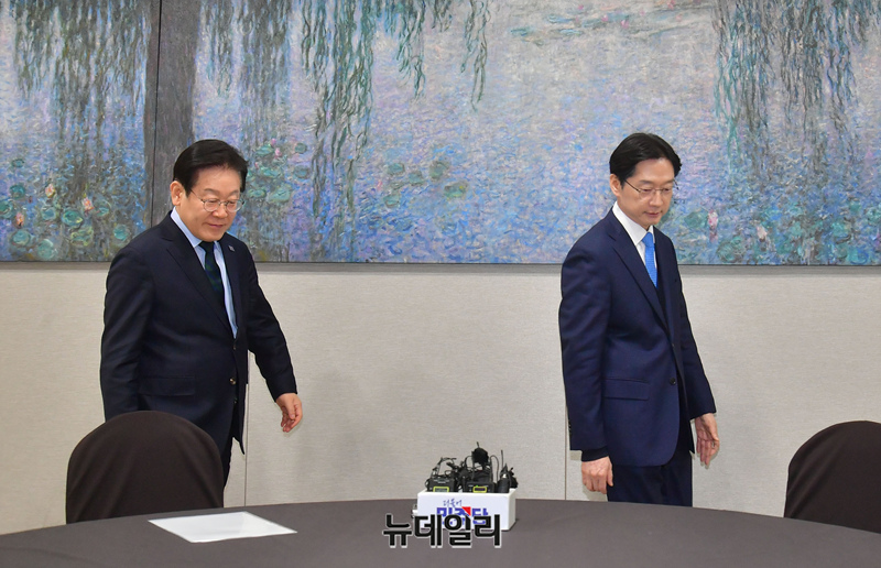 이재명 더불어민주당 대표와 김경수 전 경남도지사가 13일 오후 국회에서 회동을 갖기 위해 입장하고 있다.
