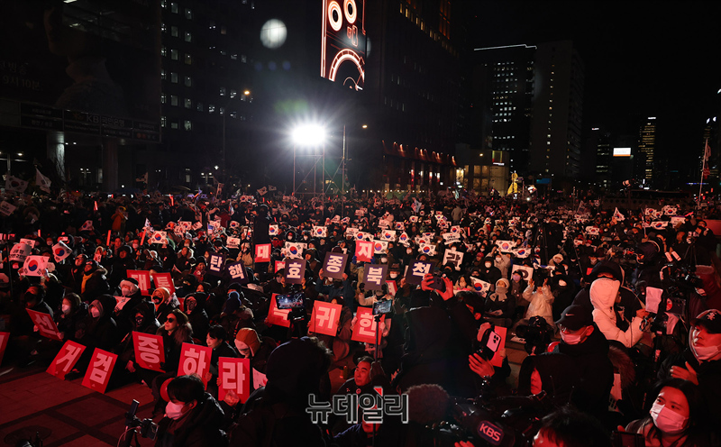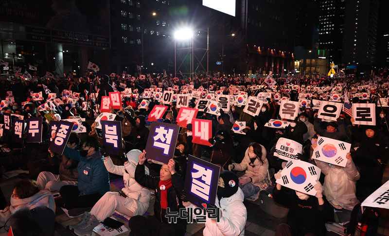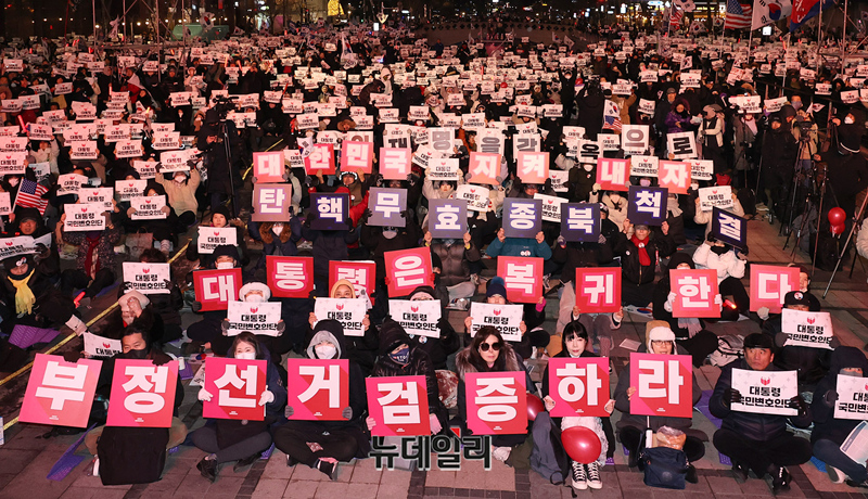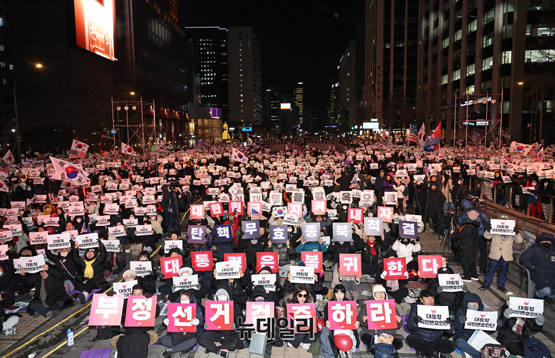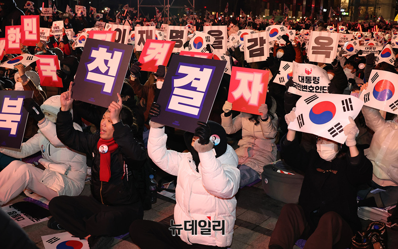 '윤석열 대통령 국민변호인단 출범식' 참석 시민들이 13일 오후 서울 청계광장에서 열린 출범식에서 탄핵무효 구호를 외치고 있다.