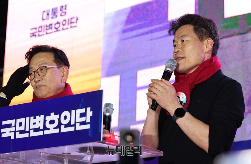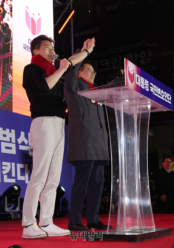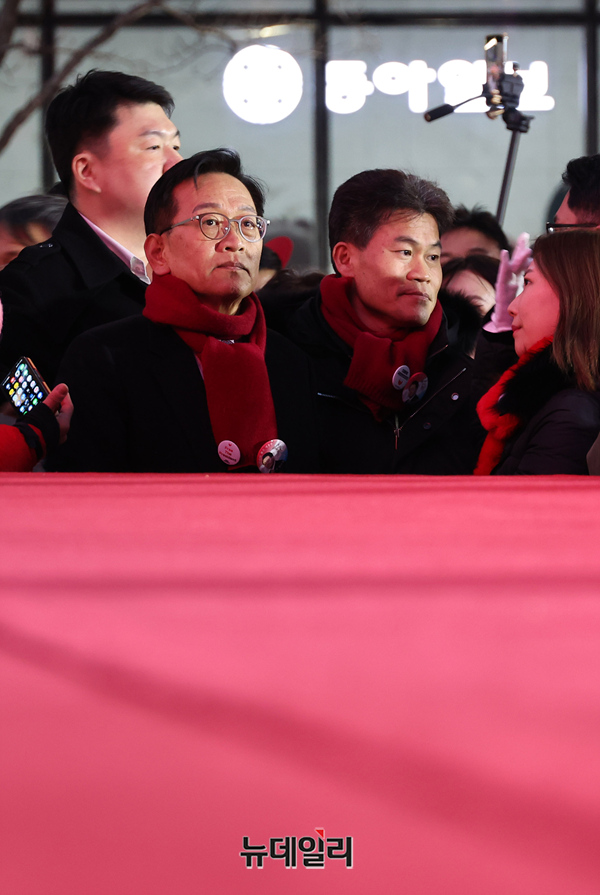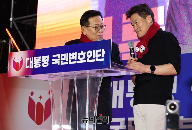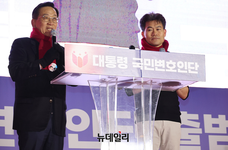 전한길 한국사 강사와 단장을 맡은 석동현 변호사가 13일 오후 서울 청계광장에서 열린 '윤석열 대통령 국민변호인단 출범식'에서 입장 준비를 하고 있다.