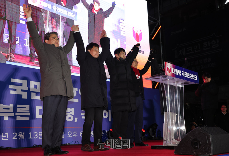윤석열 대통령 변호인단이 13일 오후 서울 청계광장에서 열린 '윤석열 대통령 국민변호인단 출범식'에서 연단에 올라 인사를 하고 있다.